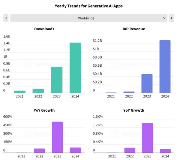 【CNMO科技音尘】近日,移动支配分析机构Sensor Tower发布叙述指出,2024年内行手机用户在AI聊天机器东说念主及AI艺术生成支配上的开销已达到12.7亿好意思元,其中聊天机器东说念主支配孝敬了10.7亿好意思元。与之比拟,这一数字在2022年仅为3000万好意思元,2023年则赶快增长至4.55亿好意思元。Sensor Tower展望,若现时的增长趋势得以陆续,AI聊天机器东说念主支配有望在2025年置身非游戏类支配消费者开销的前十大类别。