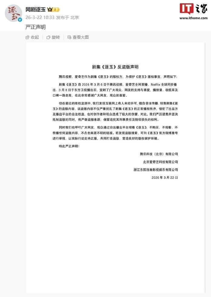 腾讯视频、爱奇艺行动剧集《逐玉》的版权方,为保护《逐玉》版权事宜,声明如下: